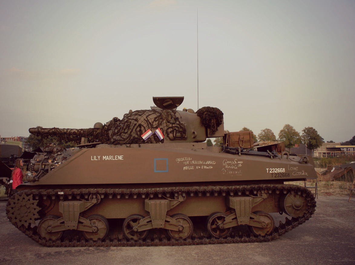 writing her name on a Sherman tank,